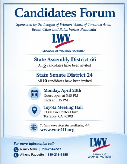 The South Bay League of Women Voters (Beach Cities, Torrance, and Palos Verdes Peninsula) will hold a candidate forum for State Assembly District 66 and State Senate District 24 races on April 20 in the Toyota Meeting Hall, Torrance Civic Center, from 5 to 9 pm.